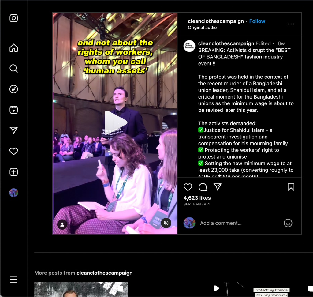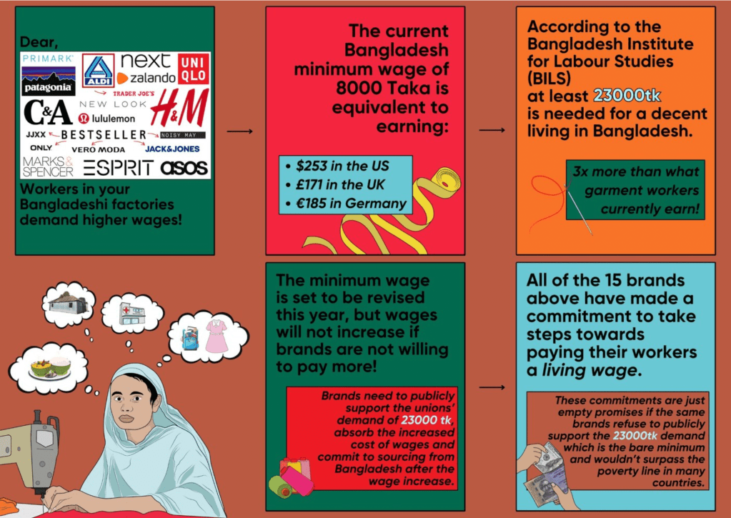 Programs such as their Urgent Appeal system are set in place to offer support for workers fighting against unethical practices within workshops. Through some research on their website, I found one of the latest campaigns they have launched, which brings attention to workers’ wages in Bangladesh. Unions throughout Bangladesh have struggled to find momentum and support in their efforts to their monthly minimum wage to 23,000 takas or about $212 USD.