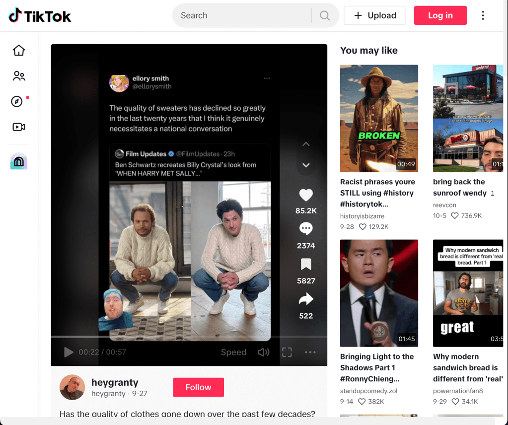 At first glance, the tweet to the right just seems like a harmless recreation of Billy Crystal’s promo photoshoot for When Harry Met Sally. However, as user @ellorysmith states, the comparison of clothing is striking. The photo of the tweet was brought to my attention by TikTok user @heygranty, who also talks about planned opalescence. The process of creating items that are meant to break easily or go out of style in the next few years, for companies to maximize production and profit. As he ended his video asking viewers if they believe the quality of clothing has declined, it struck me that he was right. We live in an age when synthetic fabrics and fibers fill our malls, all while prices skyrocket. While planned obsolescence typically applies to technology over clothing, what differentiates vintage clothing quality from present-day fast fashion?